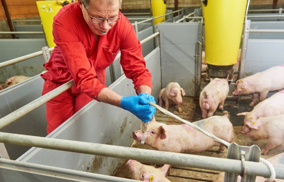 Voor zeugenbedrijven is speekselmonsters nemen een goede diagnosetool om de vinger aan de pols te houden bij griep of PRRS. Die ziekten blijven op een zeugenbedrijf vaak rondzingen. Schreurs neemt dan speekselmonsters van biggen op twee, vier en zes weken na spenen en van biggen vlak voor het leveren.